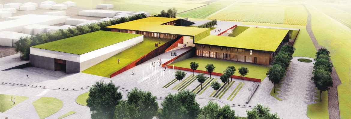 L’area destinata ad accogliere le scuole presenta sia difficoltà sia opportunità. La collocazione, marginale rispetto al centro del paese, può apparire pregiudizievole ma in realtà, guardando con attenzione, si scopre che questo sito ha la possibilità di assurgere ad un ruolo superiore grazie alla presenza di altri  servizi collettivi: campo da calcio, cimitero, monumento ai caduti, viale delle rimembranze. Questo significa attestare un “nuovo” polo civico al termine dell’asse lineare che fuoriesce dal paese. L’insediamento scolastico suggella questa opportunità denotandosi come porta di accesso al paese e favorendo la formazione di nuova piazza civica laddove oggi si esiste un modesto incrocio viario. Il nuovo complesso si conforma come un portale che incornicia la direttrice da e verso l’abitato, punto di incontro e scambio “ideale” tra paese e campagna. La scuola stessa è un sistema “double face”: piazza urbana verso l’abitato e spazi verdi e per il gioco verso la campagna. Il tema architettonico dominante è offerto dalla linea orizzontale dei solai di copertura che si raccordano anche verticalmente tra loro e con il terreno. Lo skyline si armonizza con il profilo sinuoso del paesaggio. Le linee si estendono, si innalzano oppure scavano il territorio, analogamente al profilo delle colline circostanti. L’edificio non è semplicemente appoggiato sul suolo ma realizza con esso un rapporto organico, quasi sensuale. Le due strutture scolastiche propongono due diversi livelli di rapporto con l’intorno, tanto quanto accade ai due livelli del percorso educativo. La scuola elementare è più protetta ed introversa (e perciò parzialmente “raccolta” nel terreno); la scuola media è più curiosa ed aperta verso l’intorno sociale e paesaggistico. La palestra, in virtù di un auspicabile utilizzo urbano, si affaccia sulla piazza tramite un ingresso mediato da una gradinata dedicata alle attività all’aperto. In questo caso la scelta di utilizzare una struttura in legno va oltre i noti vantaggi (velocità, efficienza energetica, industrializzazione e sostenibilità)  per unirsi al valore educativo e propedeutico di rispetto dell’ambiente e di proposizione di una cultura del costruire che supera il pregiudizio speculativo di cui è affetta per ritornare, come un tempo, ad essere testimonianza della qualità culturale e civica di un popolo.