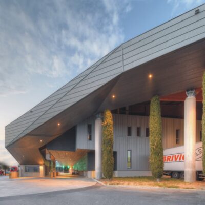 Le pareti dell’involucro esposte all’acqua sono rivestite in aggraffato di alluminio (copertura), aggraffato di zinco-titanio (facciate) mentre i profondi sottogronda degli sbalzi laterali (oltre 8 m di aggetto) ed i tratti inferiori (protetti dalla pioggia) delle pareti sono rivestiti con pannelli “faccia a vista” di larice colore antracite. Le pareti ed i soffitti dei reparti di lavorazione e conservazione (con temperature interne costanti comprese tra -20° e +8° centigradi) sono realizzate con pannelli frigoriferi modulari di spessore 10/12 cm in schiuma polisocianurato PIR; questi pannelli sono associati, per le principali compartimentazioni al fuoco, con pannelli di 20 cm di spessore in lana di roccia. I soffitti dei reparti, così come le guidovie a servizio delle aree di arrivo, conservazione e smistamento della materia prima, sono integralmente sospesi alle travi orizzontali di copertura che hanno luce intermedia fino a 36 m e sbalzi laterali di oltre 8 m. Gli uffici direzionali ed amministrativi sono contenuti in una palazzina a due piani affiancata allo stabilimento. Gli uffici di reparto (controllo qualità) sono collocati a quota sopraelevata e sono collegati direttamente con il primo piano della palazzina uffici. Una grande scala in acciaio zincato dalle fattezze volutamente scultoree (lato est fronte autostrada) da accesso al piano tecnologico posto nel sottotetto ed alla copertura stessa (predisposta per impianto fotovoltaico da 100 kw). Due portoni aerei motorizzati (uno per lato) consentono la manutenzione e/o sostituzione dei macchinari localizzati nel sottotetto. Una teoria di scale e passerelle perimetrali in acciaio zincato consente l’evacuazione delle aree di lavorazione poste a quota rialzata (+1,60 circa). Un ponte di ampie dimensioni permette l’ingresso/uscita dei macchinari di lavorazione aventi dimensione maggiore a quelle delle baie di carico dei bilici. Il fronte est (lato autostrada) è caratterizzato da una sequenza di portali di controvento che hanno permesso di recuperare le strutture in CA del piano seminterrato dell’edificio preesistente sgravandole da compiti statici che, a seguito dell’incendio, non erano più in grado di assicurare. L’evacuazione delle acque della copertura è realizzato con sistema a depressione che consente di realizzare una rete priva di pendenze sub orizzontali e di contenere sia i diametri delle tubazioni sia il numero dei pluviali (in numero di cinque per un totale di circa 10000 mq).