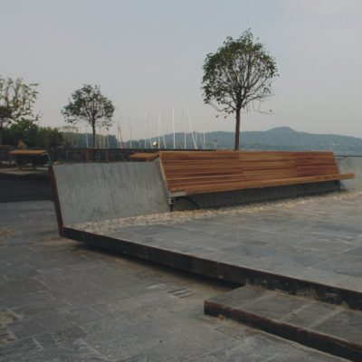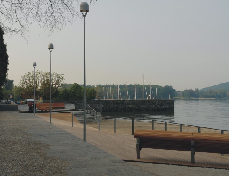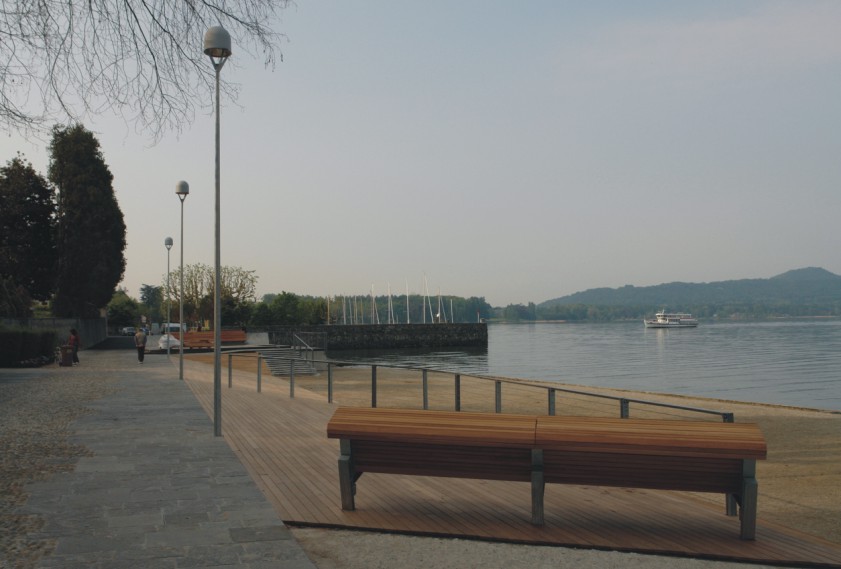Passeggiare, sostare, conversare, giocare, bagnarsi e distendersi al sole, praticare sport (vela, jogging, ecc.), sono alcune delle attività che si sovrappongono sul lungolago; la tipologia degli spazi deve suggerire, ma senza confinamenti, gli ambiti di attività omogenee: balneazione, intrattenimento e relax, passeggio. Gli spazi per sedersi, sdraiarsi, per le attività ludiche di bambini e ragazzi e gli spazi aperti e di ristoro (bar/caffetteria) sono collocati su un tappeto pavimentato in legno. I materiali svolgono un ruolo essenziale nel definire le modalità d’uso degli spazi, il senso d’accoglienza e di conforto offerti da pavimentazioni e da piani in legno, opportunamente conformati per sedersi e sdraiarsi, favorisce modalità di utilizzo disinvolte ed informali. L’ambito interessato dal progetto è inserito in un qualificato quadro paesaggistico. Il progetto confina con un piccolo edificio soggetto a vincolo monumentale (Ufficio Turistico). Si è posta particolare attenzione a non interferire con la valenza panoramica del luogo utilizzando, per le nuove opere, materiali naturali e consoni alla tradizione del luogo. Particolare riguardo è stato posto alla valorizzazione dei manufatti storici esistenti anche se, gli stessi, non sono interessati dalle opere in progetto. In particolare si segnalano la pavimentazione che ricama un tappeto in beola e rizzada attorno all’Ufficio Turistico e l’illuminazione che valorizza la cinta muraria del confinante parco storico. I materiali rispondono alle esigenze ambientali, estetiche, di confort e d’uso, oltre che manutentive. Beola ed acciottolato (rizzada) offrono congiunte garanzie di durabilità e compatibilità ambientale e storica con i luoghi. Per il tratto compreso tra la passeggiata e la spiaggia si sono utilizzate doghe di legno di ipè: adeguata risposta al bisogno di una superficie invitante per la balneazione ed, al contempo, gradevole, duratura e resistente. L’acciaio corten e quello zincato, utilizzato per i parapetti ed i cordoli, consente una notevole snellezza dimensionale e gode di un’eccezionale compatibilità estetica grazie alla ossidazione naturale.